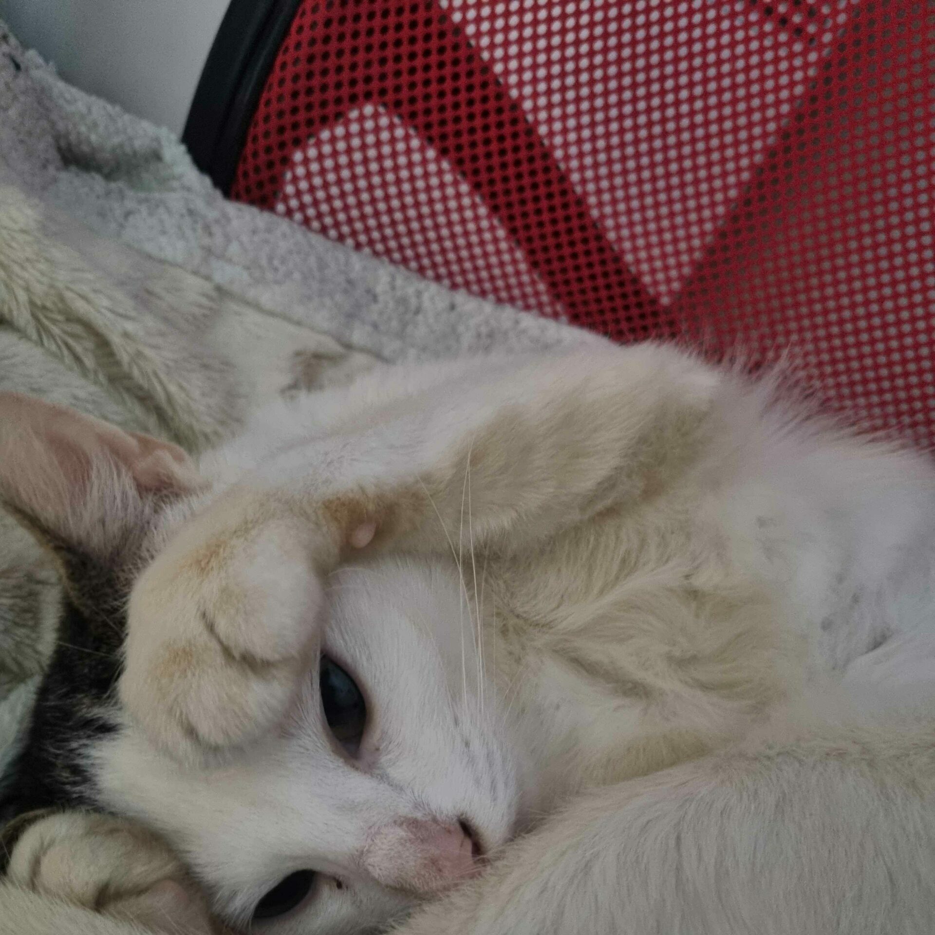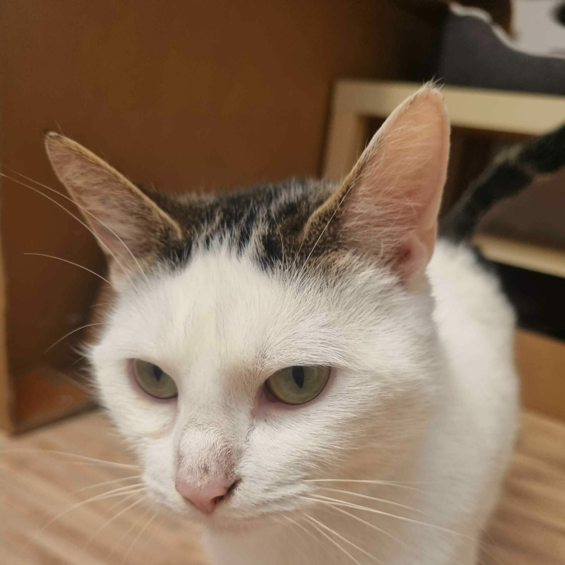 Cette jolie minette blanche tigrée de 4 ans est sensible, douce et toujours respectueuse.