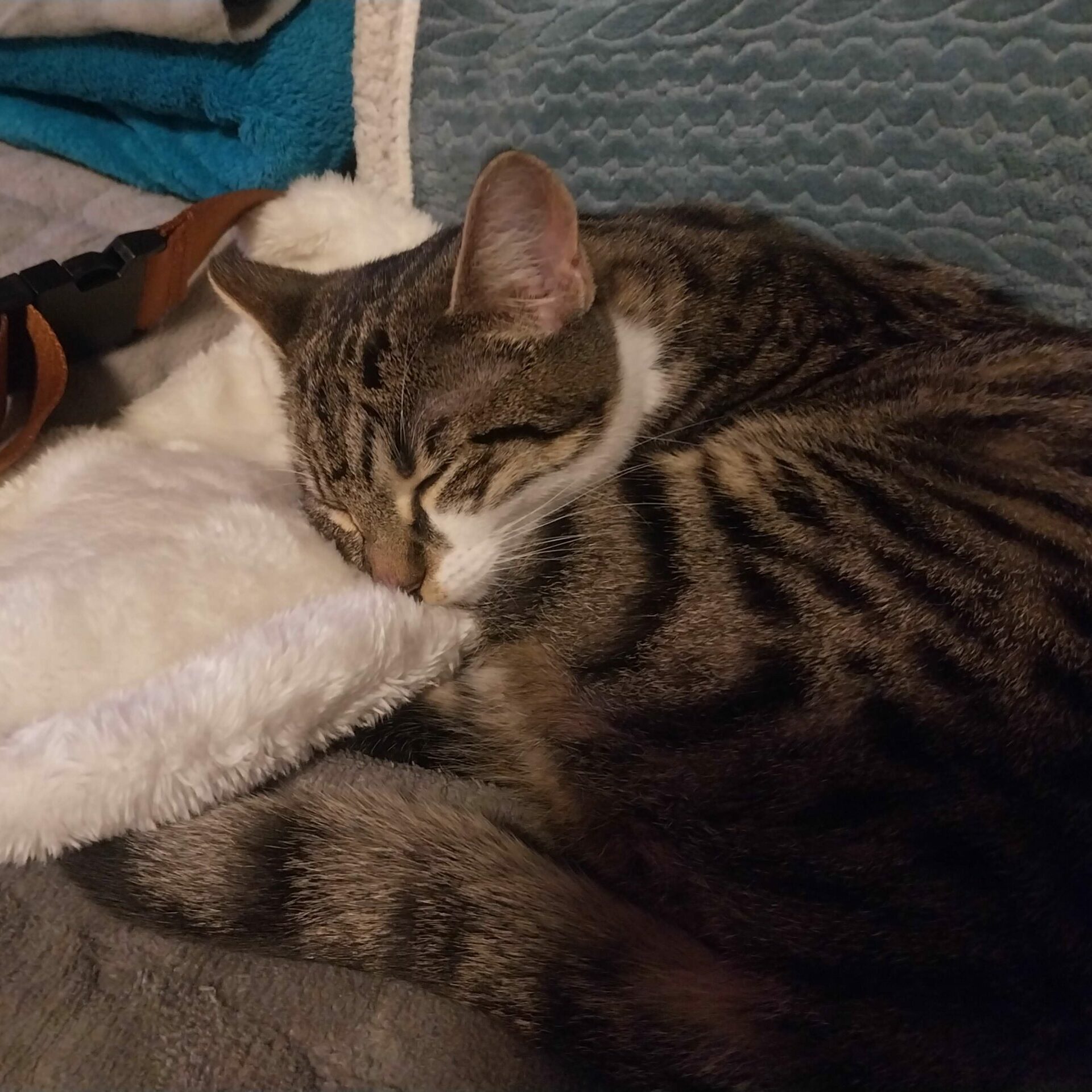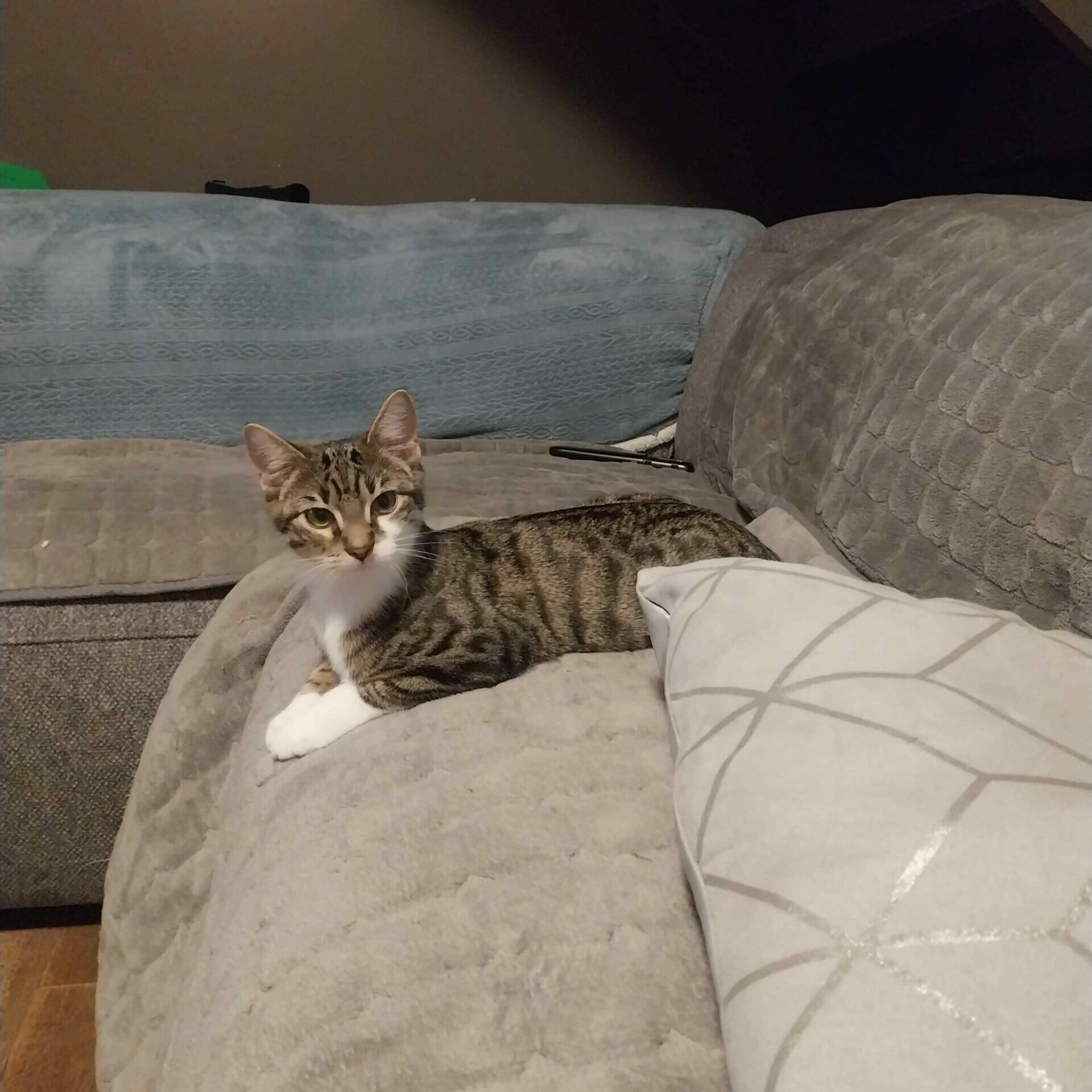 Cléo est une jeune chatte tigrée blanche de 5 mois, pleine de vie et d’énergie.