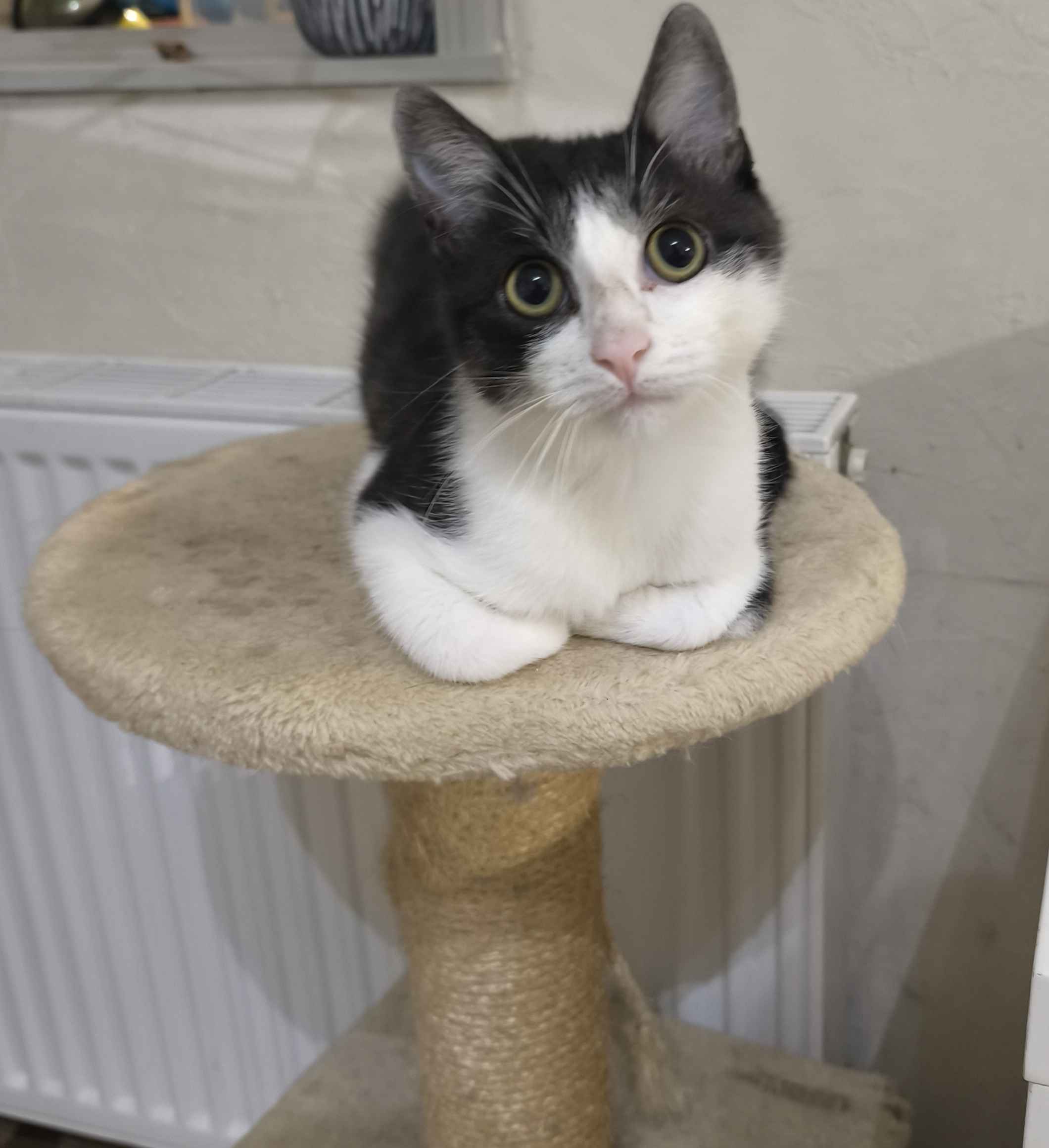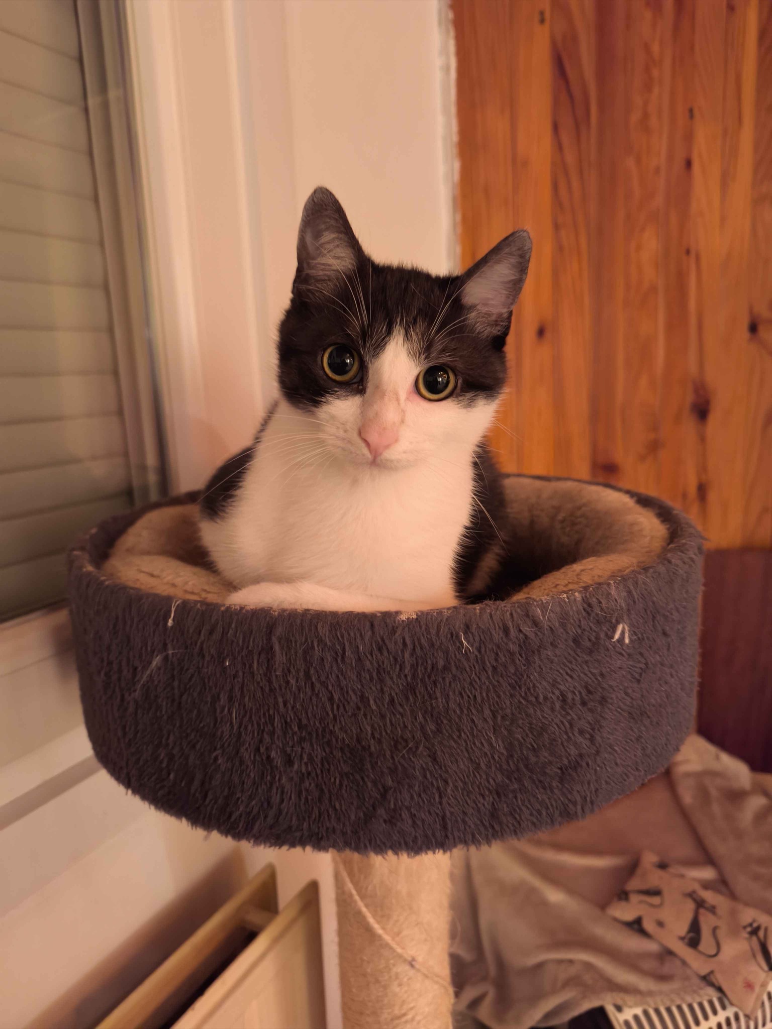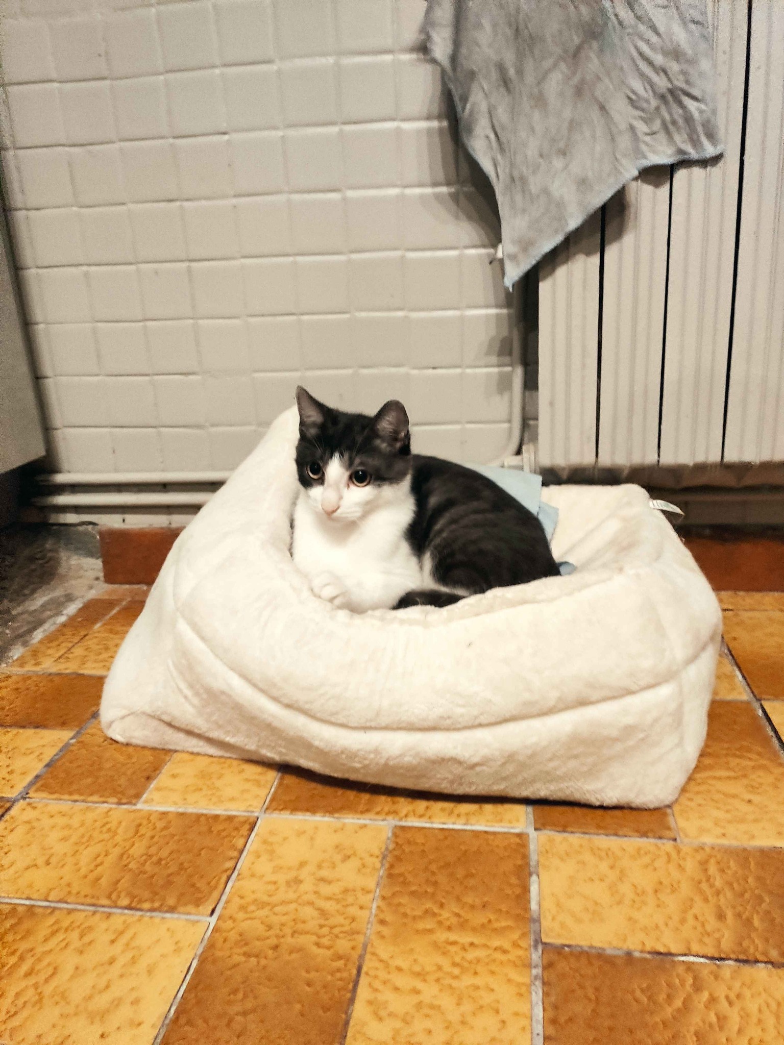 Il est plutôt discret au début, mais une fois en confiance, il devient curieux, un peu bavard, et commence à accepter les caresses (quand il est d’humeur). Ce n’est pas un chat câlin à la base, mais il progresse doucement. Il a besoin de stabilité et d’un environnement rassurant.