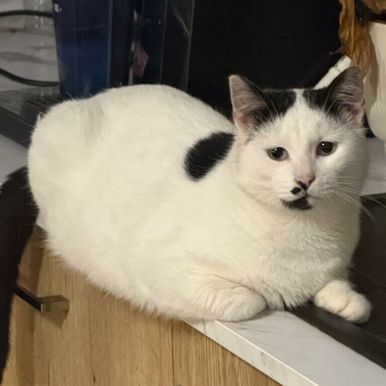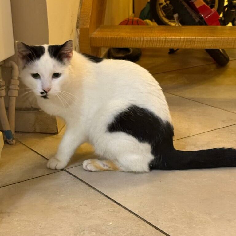 Stitch, jeune chat blanc et noir d’un an, est maintenant prêt à trouver sa famille four la vie !